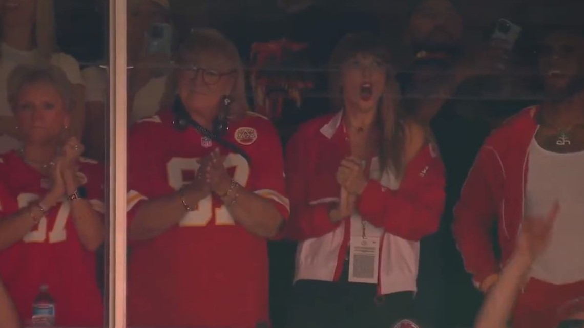 Superstar singer Taylor Swift seen cheering on Travis Kelce next to his mom at Chiefs game